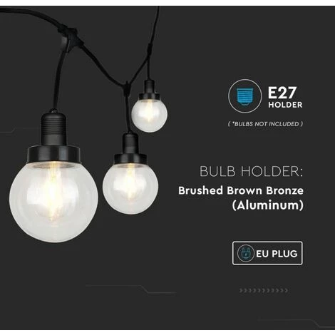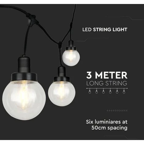 Caténaire de 3m pour 6 ampoules LED E27 Avec diffuseurs transparents IP65 Couleur noire.