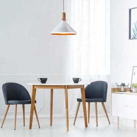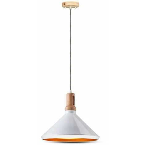Lustre LED Conique en Métal avec Douille E27 (Max 60W) Couleur Blanc Brillant et Fixation en Bois
