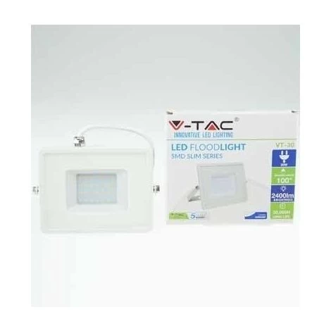 V-TAC PRO Projecteur LED 30W Chip LED Samsung SMD, blanc chaud 3000K 2.400LM A+ 100° IP65 – Slim Blanc Brillant VT-30 – SKU 403
