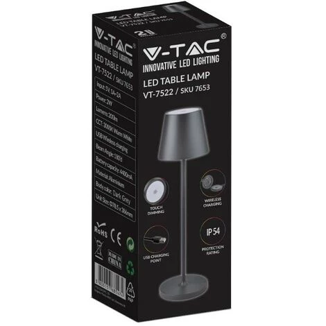 Le VT-7522 attire l’attention dans la maison. Avec sa batterie intégrée, il est facile à placer partout. L’autonomie de la batterie est de 8 à 10 heures. La recharge de la lampe prend au maximum 6 à 8 heures si elle est complètement vide. Le chargement de la lampe est facile grâce à la station de charge sans fil incluse.